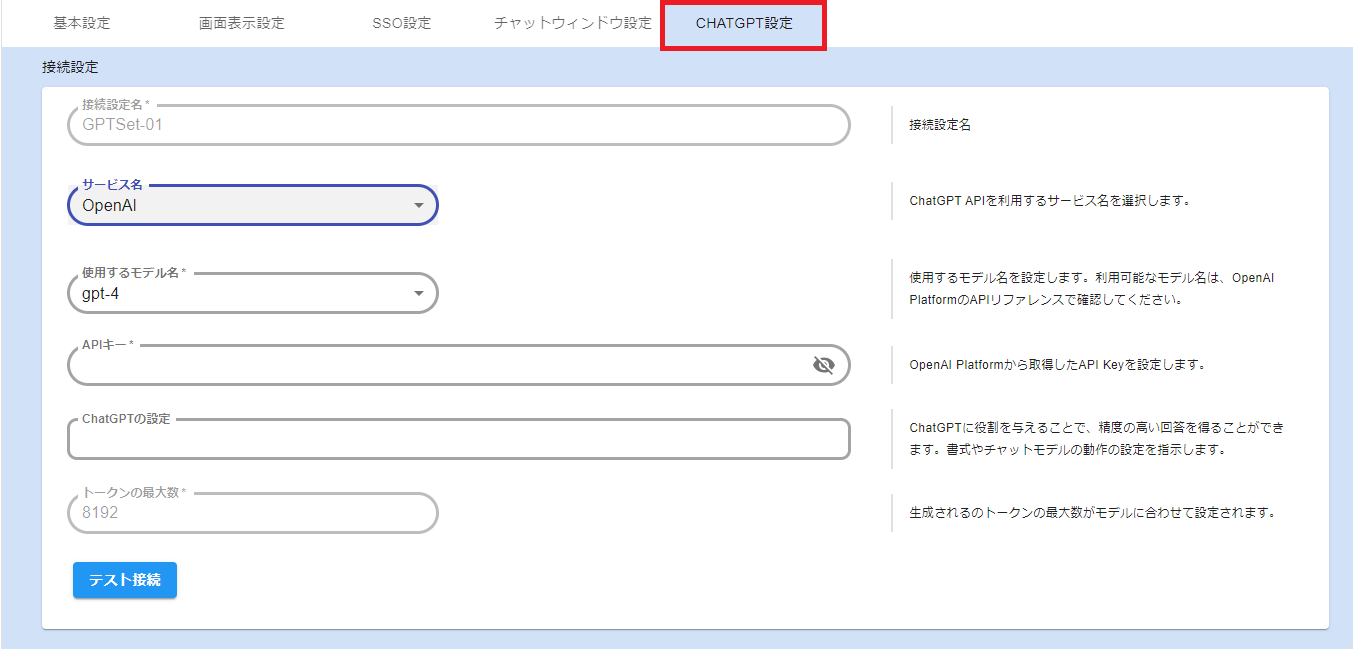 管理画面内の設定メニューを開き、「CHATGPT設定」タブでChatGPT APIの設定を行います。
