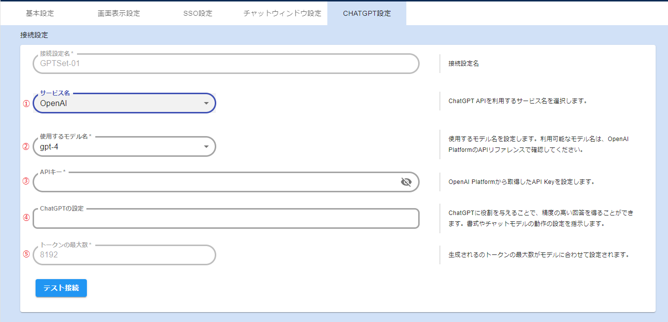 - 使用するChatGPTのモデルを設定してください。 使用する上での必須設定項目は以上ですが、その他ChatGPTを使用するための設定等につきましては機能説明書 管理者編の設定、ChatGPT設定「機能説明書 管理者編の設定、ChatGPT設定」もあせてご参照ください。