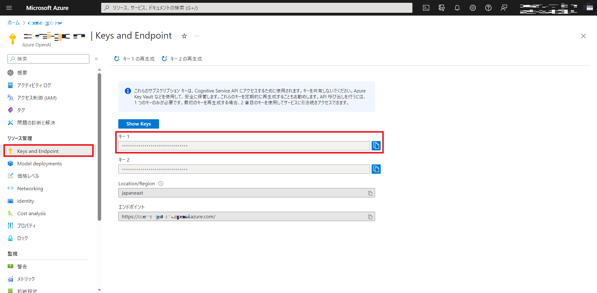 | ① | サービス名 | 利用するサービスを選択します。 (Azure OpenAIを選択する) |