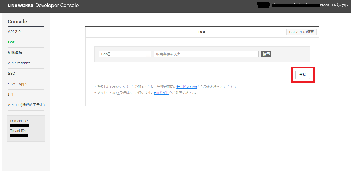 - 表示されたBot管理画面で登録ボタンをクリックします。