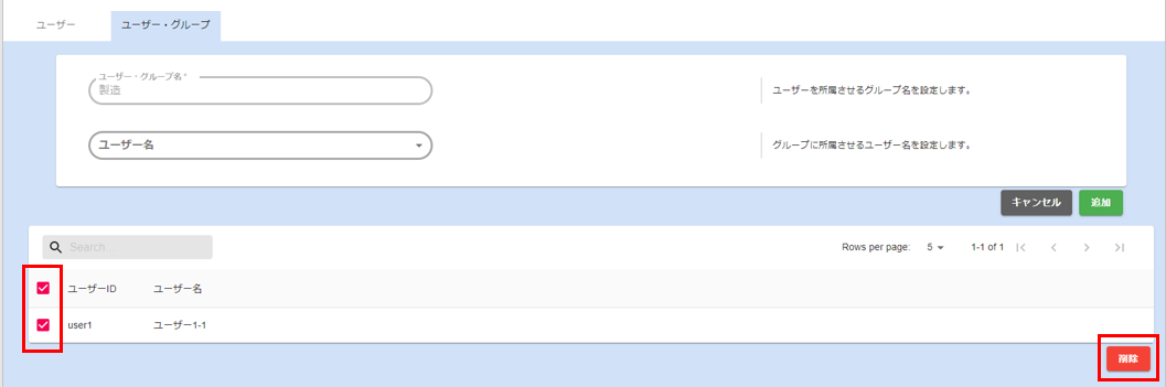 グループから解除したいユーザーをチェックボックスで選択し、削除ボタンをクリックします。