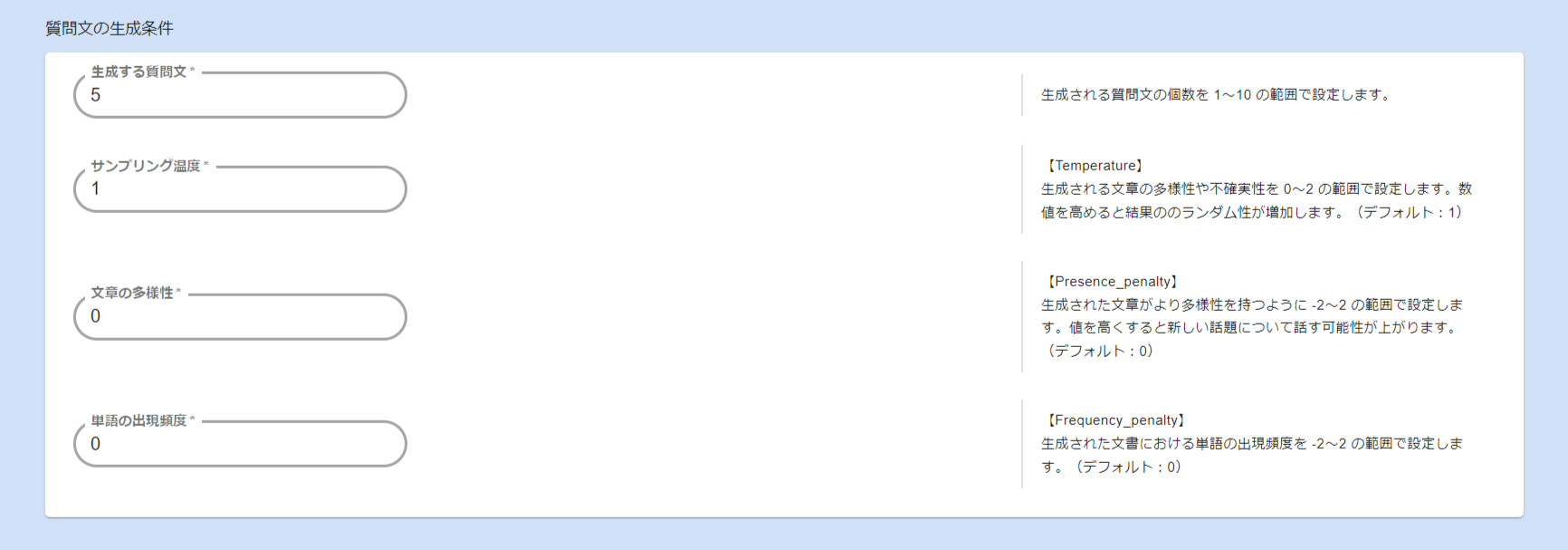 ※バージョン3.9のアップデートに伴い、以下画面、質問文の生成条件の設定値を初期化いたします。お手数ですが当該項目の値の変更を行っていた場合には再設定をお願いします。