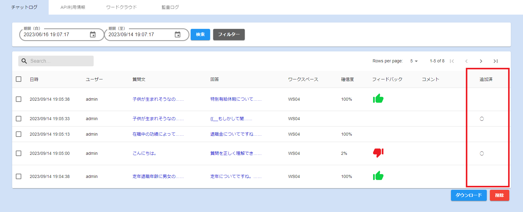 2ログ一覧画面に質問をワークスペースへ追加済みであることを示す「追加済」列を追加しました。管理画面CB3