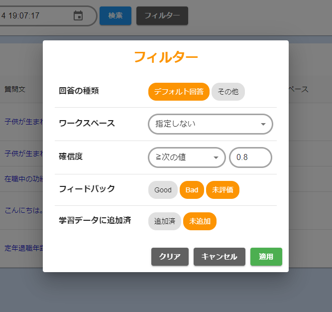 • 学習データをインポートする場合に、質問文と回答文をセットで取り込まれるように変更いたしました。データの取り込みを行う場合には、必ず質問と回答をセットにして取込みを行ってください。また、ダウンロードした学習データのzipファイルをそのまま取込みファイルとして指定し、取込みができるようになりました。